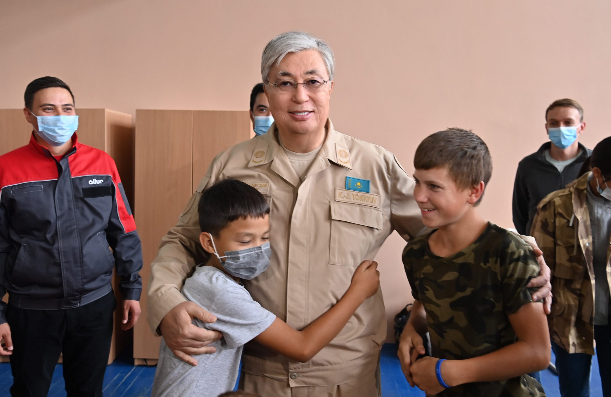 Мемлекет басшысы Әулиекөл ауылындағы мектепте орналасқан эвакуациялау пунктінде зардап шеккен азаматтармен кездесіп, гуманитарлық көмек тарату пунктінің жұмысымен танысты.