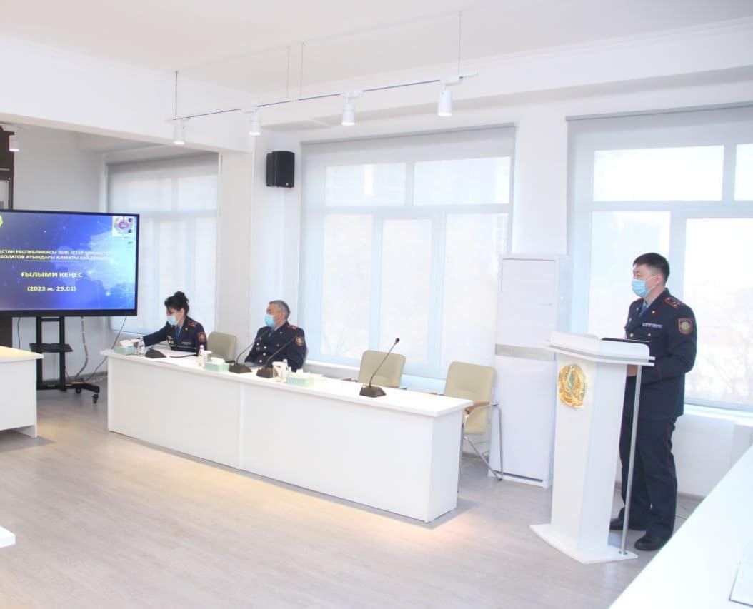 Ғылыми кеңестің төрағасы, саяси ғ.д., з.ғ. к., қауымдастырылған профессор (доцент), полиция полковнигі А. Сайтбеков Қазақстан Республикасы ІІМ-нің алқасында ведомстволық ғылымды дамыту мәселелері ішкі істер қызметін жетілдірудің басым бағыттарының бірі ретінде қарастырылғанын атап өтті. Бұл тұрғыда Ғылыми кеңестің күн тәртібіне Академияның ғылыми қызметіне, атап айтқанда, ғылыми мектептердің, Жас ғалымдар кеңесі (ЖҒК) және докторлық диссертацияларды (PhD) қорғау жөніндегі Диссертациялық кеңестің жұмысына қатысты бірқатар мәселелерді енгізу қисынды болды.