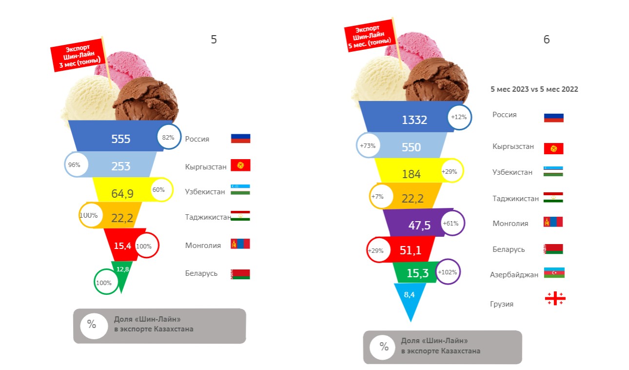 Экспортқа келетін болсақ, 2023 жылдың үш айында 2022 жылдың ұқсас кезеңімен салыстырғанда Қырғызстанға (739,1 мың АҚШ доллары сомасына) және Өзбекстанға (399,3 мың АҚШ доллары сомасына) жеткізілімдердің екі еседен астам өскенін ерекше атап өткен жөн. Бұл ретте балмұздақты шетелдік нарықтарға жеткізу бойынша біріншілікті «Шин-Лайн» компаниясы ұстап тұр-оның Өзбекстан нарығындағы қазақстандық өндірушілер арасындағы ең төменгі үлесі – 60%, Ресей нарығында – 82,4%, Қырғызстан нарығында – 96%, ал Тәжікстанда, Моңғолияда және Беларусьте қазақстандық балмұздақ тек «Шин-Лайн» брендімен ұсынылған. Биыл қазақстандық балмұздақ өндіруші өз өнімдерін жеткізетін елдердің тізімін Әзірбайжан және Грузия мемлекетімен толықтырды.