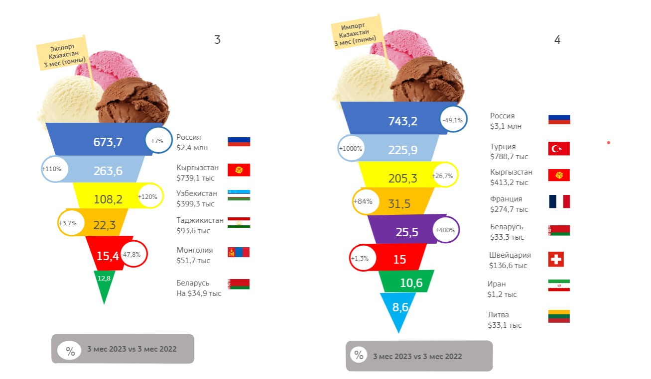 Егер нарықтың сыйымдылығы «өндіріс + импорт-экспорт» формуласымен есептелетінін ескеретін болсақ, онда себептерді өндіріс пен импорттың қысқаруынан немесе экспорттың өсуінен іздеу керек, дейді сарапшы. Статистика деректері бойынша қазақстандық кәсіпорындардың балмұздақ өндірісі 2021 жылы 42 324 тоннадан 2022 жылы 41 333 тоннаға дейін төмендеген немесе 2,3% — ға қысқарған, сол кезеңде импорт 9,7 мың тоннадан 9,3 мың тоннаға дейін түскен немесе 4,3% — ға қысқарды, 2023 жылдың үш айында импорт тағы 24% — ға төмендеді. Сонымен қатар, Қазақстаннан балмұздақ экспорты 2021 жылы 3,3 мың тоннадан 2022 жылы 5,05 мың тоннаға дейін өскен және 2023 жылдың үш айында оң динамиканы көрсетті, бұл 2022 жылдың сәйкес кезеңімен салыстырғанда елде балмұздақ экспорты 28% — ға өсті деген сөз.