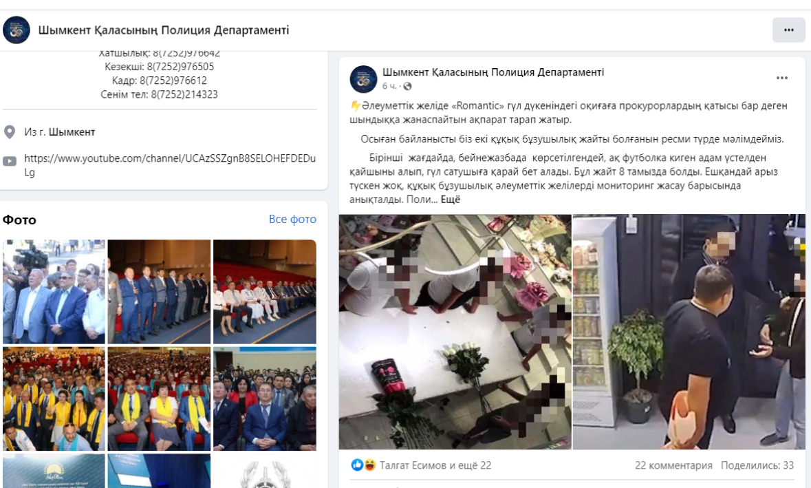 Бірінші жағдайда, бейнежазбада көрсетілгендей, ақ футболка киген адам үстелден қайшыны алып, гүл сатушыға қарай бет алады. Бұл жайт 8 тамызда болды. Ешқандай арыз түскен жоқ, құқық бұзушылық әлеуметтік желілерді мониторинг жасау барысында анықталды. Полиция қызметкерлері бұзақыны анықтап, Тұран АПБ-на жеткізді. Азамат К. 1990 жылы туған Түркістан облысының тумасы болып шықты. Шымкент қаласында тұрады. Оның әкесі 1952 жылы туған, зейнеткер. Бәйдібек ауданында тұрады. Ер адам сот қаулысымен ҚР ӘҚБтК 434-бабына сәйкес «ұсақ бұзақылық» 7 тәулікке қамауға алынды.Екінші бейнеде басқа азамат бейнеленген. Атап айтқанда, 1989 жылы туған азамат Б. әкесі жоқ, анасы зейнеткер. Ағымдағы жылдың 8 мамырында ер адам флористті қорлап, дүкеннен гүл шоғын алып кеткен. Тұран АПБ-ның 102 арнасына жанжал туралы қоңырау түсті. Оқиға орнына учаскелік инспекторлар келді. Алайда, дүкен иесі жергілікті тұрғын мән-жайды анықтау барысында ешкімге шағымы жоқтығын айтып, арыз жазудан бас тартты. Осыған байланысты, сіздерді тек ресми дереккөздерге сенуге шақырамыз»