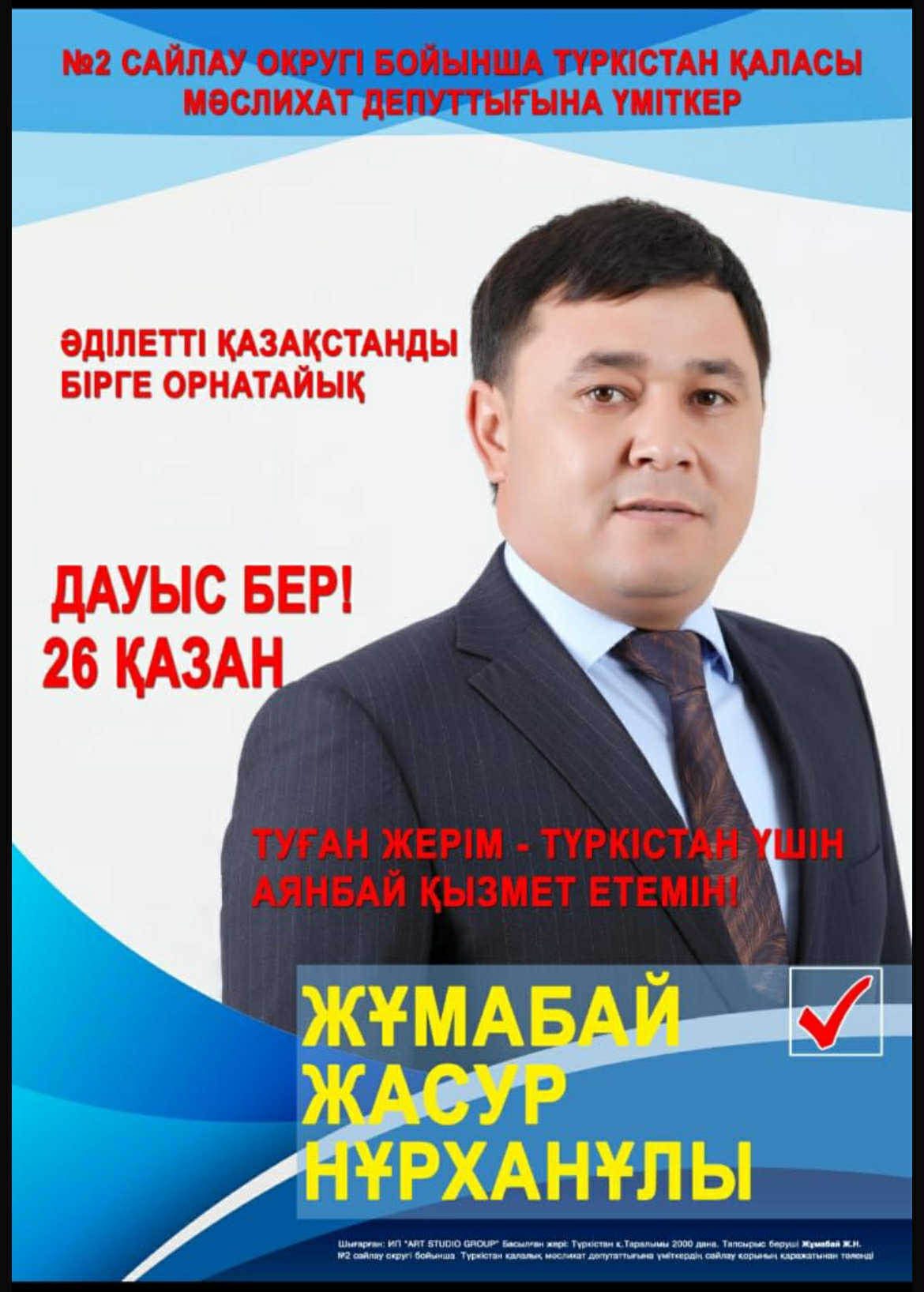 МЕН СІЗДЕРДІҢ СЕНІМДЕРІҢІЗДІ АҚТАП, ТҮРКІСТАННЫҢ ДАМУЫНА БАР КҮШ-ЖІГЕРІМДІ ЖҰМСАЙМЫН. ӘДІЛЕТТІ ҚОҒАМДЫ – БІРГЕ ҚҰРАЙЫҚ!- дейті үміткер Жұмабай Жасур Нұрханұлы