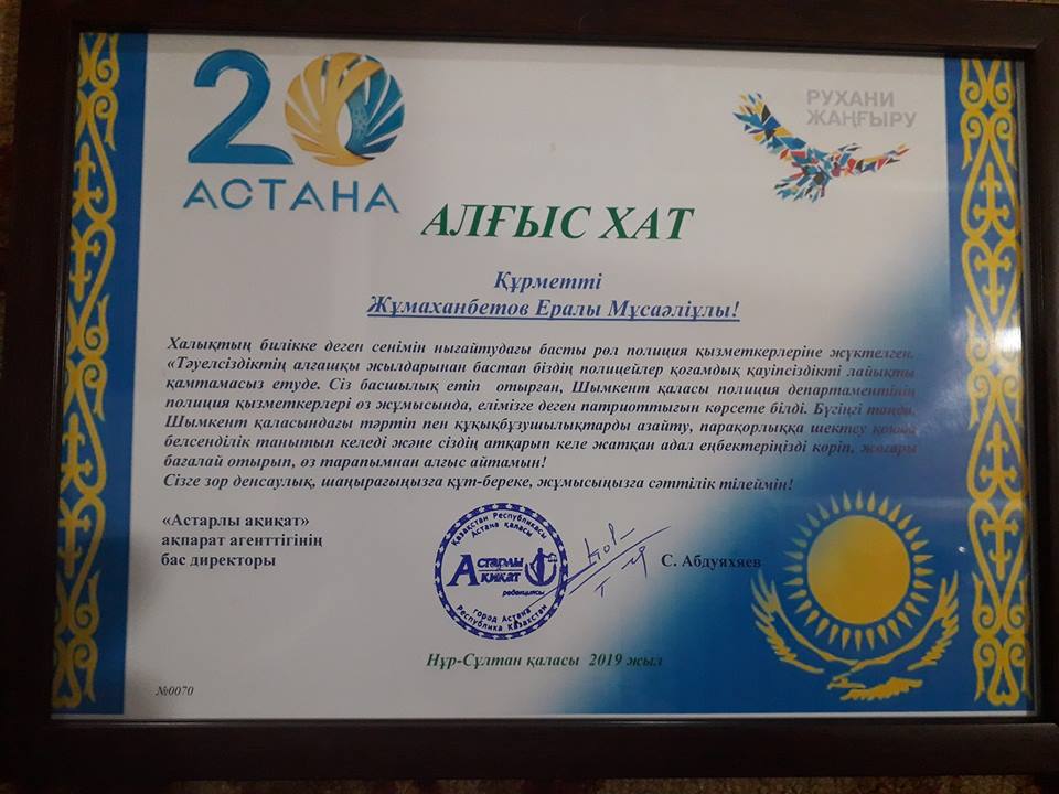 Халықтың билікке деген сенімін нығайтудағы басты рөл полиция қызметкерлеріне жүктелген. «Тәуелсіздіктің алғашқы жылдарынан бастап біздің полицейлер қоғамдық қауіпсіздікті лайықты қамтамасыз етуде. Сіз басшылық етіп отырған, Шымкент қаласы полиция департаментінің полиция қызметкерлері өз жұмысында, елімізге деген патриоттығын көрсете білді. Бүгіңгі таңда, Шымкент қаласындағы тәртіп пен құқықбұзушылықтарды азайту, парақорлыққа шектеу қоюда белсенділік танытып келеді және сіздің атқарып келе жатқан адал еңбектеріңізді көріп, жоғары бағалай отырып, өз тарапымнан алғыс айтамын!