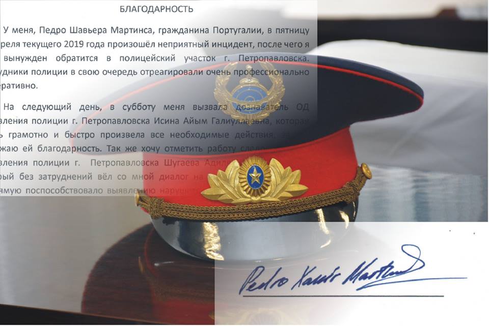 Приятно удивлённый работой петропавловских полицейских, португалец написал благодарственное письмо на имя начальника ДП СКО генерал-майора полиции Берика Билялова, в котором подчеркнул грамотную работу дознавателя отдела дознания УП г. Петропавловска Айым Исиной, «…которая очень быстро и грамотно провела все необходимые действия. Также хочу отметить работу следователя Адиля Шугаева, который без затруднений вёл со мной диалог на английском языке, что напрямую способствовало раскрытию дела в тот же день «по горячим следам». Хочу выразить свою признательность и благодарность сотрудникам полиции за их профессионализм и отзывчивость», — пишет он.