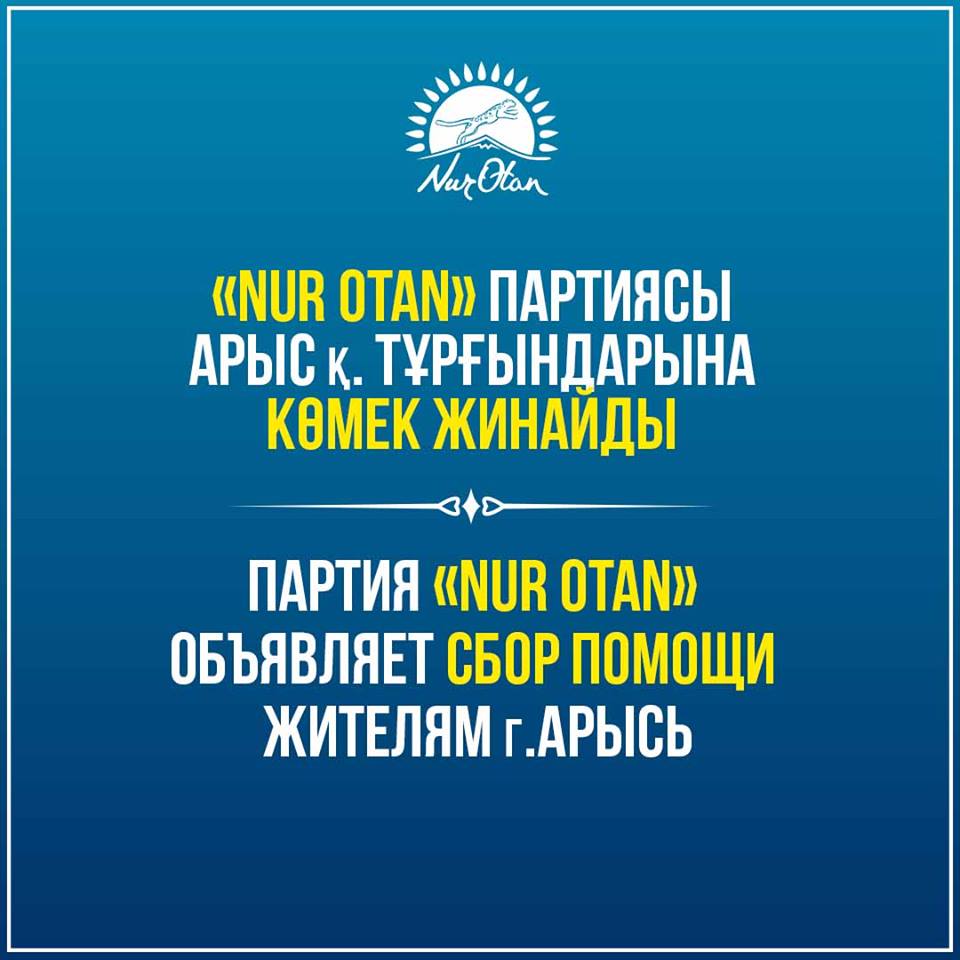 Апаттың айтып келмейтіні белгілі. Сондықтан Арыстағы төтенше жағдайдың зардаптарын жоюға бүкіл халық болып атсалысу – баршамыздың азаматтық міндетіміз. Сол себепті «Nur Otan» партиясы Орталық аппаратының қызметкерлері жарылыстан зардап шеккен азаматтарға көмек ретінде бір күндік жалақыларын аудару туралы шешім қабылдады.