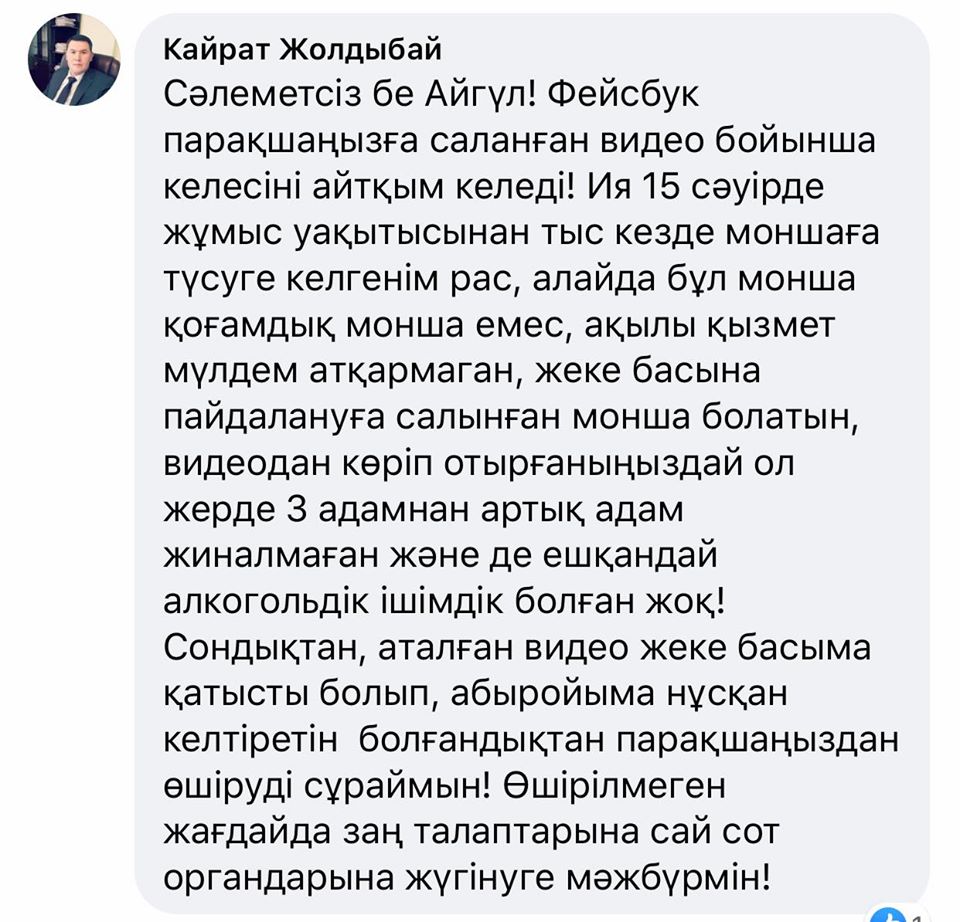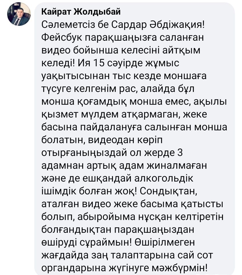 Сіздердің жекеме ПРЕСС-РЕЛИЗ-деп жолдаған Мәліметтеріңізді алдым. «ПРЕСС-РЕЛИЗ 2020 жылдың 7 мамырында Айгүл Орынбектің әлеуметтік желіге салған «Заң бәріне бірдей емес пе?» атты материалдың ресми мәлімдемесі мынадай: Бұл жерде 2020 жылдың 15 сәуірі күні жұмыс уақытынан тыс кезде моншаға түсу ОҚИҒА орын алған»- депсіздер. Моншаға түсу ОҚИҒА екеніне еш күмән болмаса да керек. СҰРАҚ туындап жатыр. КІМДЕРДІҢ МОНШАҒА ТҮСУ ОҚИҒАСЫ орын алған, неге толықтырып, нақтылап жазбайсыздар?Егер аудан әкімінің моншаға түсу оқиғасы орын алды десеңіздер жұмыстан босатады ма?Егер бейнежазбада аудан әкімі болмаса, аудан әкімі КАЙРАТ ЖОЛДЫБАЙ атынан ашылған мынау https://www.facebook.com/kairat.zholdybai парақшадан видеоны өшірмесең сотқа жүгінуге мәжбүрмін- деп жазып жүрген кім?Тағы да сұрақ: — 2020 жылдың 7 мамырында Айгүл Орынбектің әлеуметтік желіге салған «Заң бәріне бірдей емес пе?» атты материалына жазылған жауаптың маған не қатысы бар?- Моншаға түсу қандай ОҚИҒАҒА жатады?- Моншаға түсу «оқиғасындағы» әкімнің аты неге аталмаған?- Маған сауатты жазуды үйреткісі келген мынау парақшадағы азамат https://www.facebook.com/profile.php?id=100024119700854&comment_id=Y29tbWVudDoyNjQ5MTk0Mzg1MzU2NTcyXzI2NDk1MTc0NjE5OTA5MzE%3Dәкімдік қызметкері ме, болса кім болып жұмыс жасайды?- Бұл аталған бейнежазбаны, шақырту мен келген полицейлер түсіріп таратпаса, қайдан келгенін анықтамай сотқа беруге мәжбүрмін- деп жариялауларыңыз, БАҚ тың жұмысына кедергі келтіру ме?- Бейнедазбада полицейлердің қолдарында телефон, планшеттер болды. Полицейлер таратқаны туралы ақпаратты неге анықтамайсыздар?- Әкімнің ресми сұхбат беруін кеше Кайрат Жолдыбай атынан пікір жазған талқылауда ресми сұхбат беруін сұрап еді, ресми сұхбат берулеріңізді тағыда сұранамын? Құрмет пен «Астарлы ақиқат» ақпарат агенттігінің бас директоры Сардар Әбдіжақия
