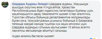 Аталған жағдайға байланысты Сардар Әбдіжақияның фейсбуктағы жеке парақшасына, Түркістан облысы, Шардара ауданы әкімдігі парақшасынан жеке , жолданға мәлімдеме жарияланады:
