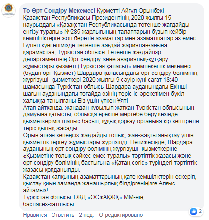 Бүгінгі күні елімізде төтенше жағдай жарияланғанына қарамастан, Түркістан облысы Төтенше жағдайлар департаментінің Өрт сөндіру және авариялық-құтқару жұмыстары қызметі (Түркістан қаласы)» мемлекеттік мекемесі (бұдан әрі- Қызмет) Шардара қаласындағы өрт сөндіру бөлімінің жүргізуші -қызметкері 2020 жылғы 9 сәуір күні сағат 18:40 шамасында Түркістан облысы Шардара ауданындағы Екінші шағын ауданындағы тоғайда өзінің теріс іс-әрекетімен бүкіл халыққа танылғаны Біз үшін үлкен Ұят!
