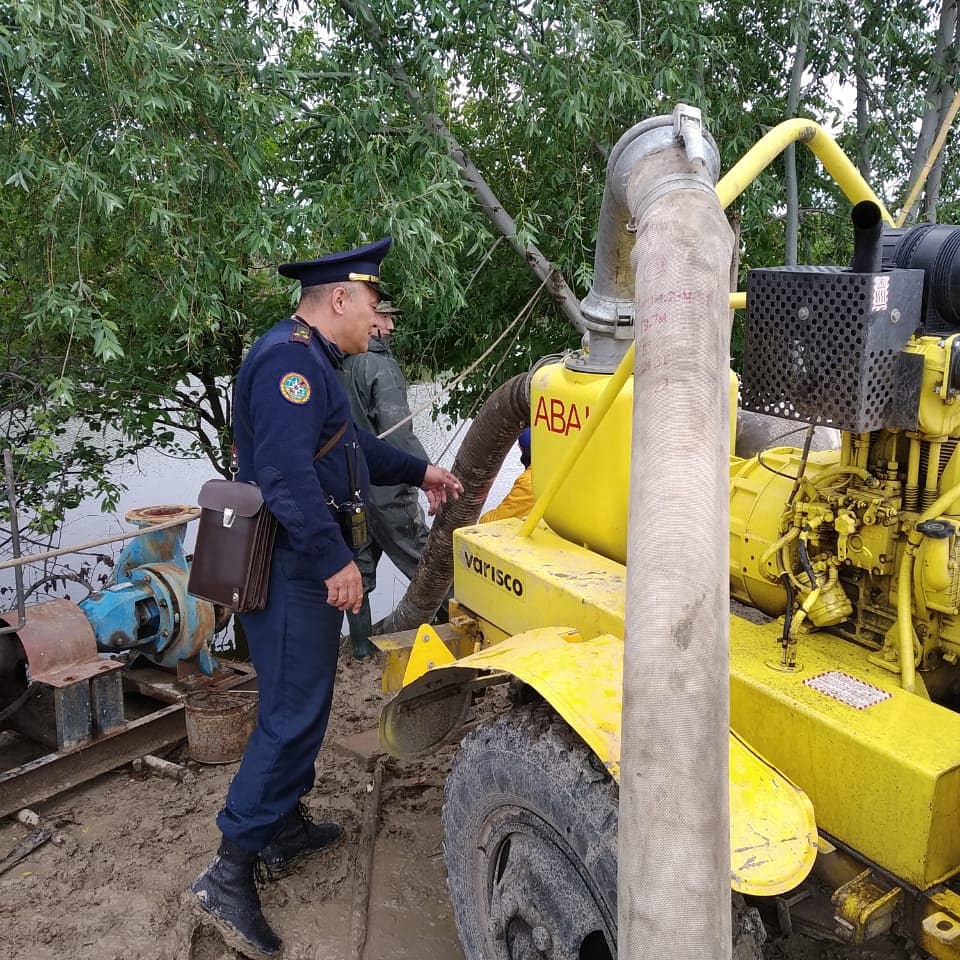 Мақтаарал ауданының Фирдоуси ауылында құтқарушылар мотор сорғыларының көмегімен суды сорып жатыр.