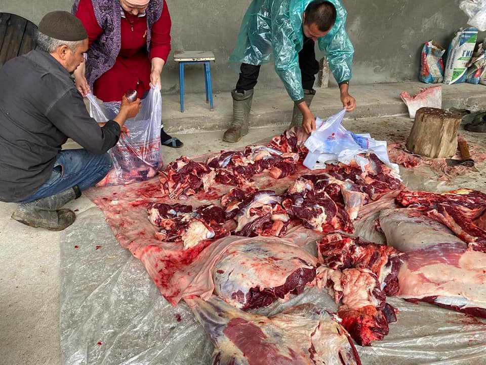 Қазір Сайрам ауданынан көрші аудана барған еріктілер тобы құрбандыққа шалынған жылқы етін жіліктеп, түскі ас ұйымдастыруда.