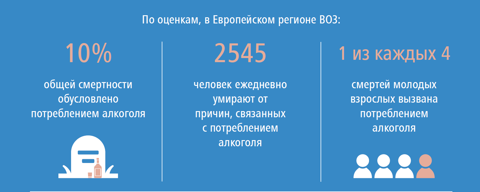 В Европейском регионе отмечается самый высокий в мире уровень потребления алкоголя, а связанная с ним смертность достигает почти 1 миллиона случаев смерти в год. Это значит, что ежедневно по этой причине умирает около 2500 человек. Алкоголь является основным фактором риска развития многих неинфекционных заболеваний (НИЗ), таких как сердечно-сосудистые заболевания, болезни пищеварительной системы и рак, и часто приводит к травмам.